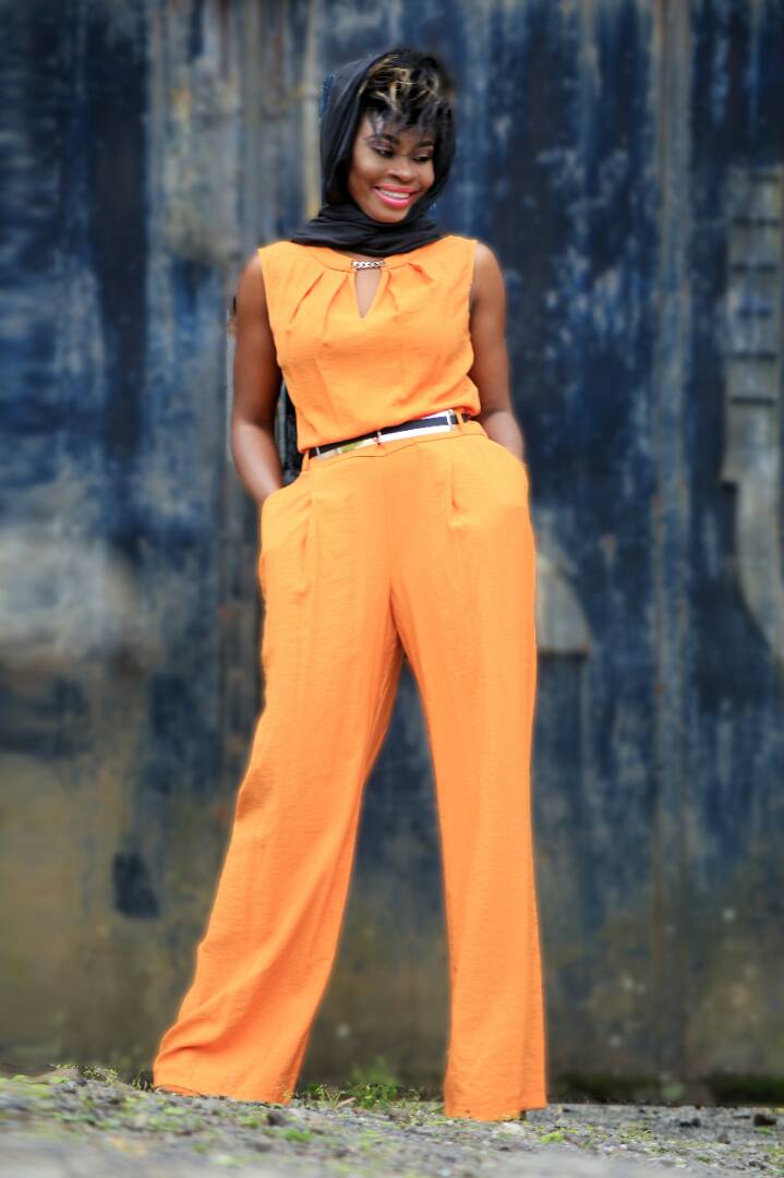 The “Blessings” singer then slides into a mango color lose jumpsuit paired with a black and gold belt and a black headscarf but its the bright pink lipstick that solidifies the entire look. Makeup artist Corine Lastar explains that was the icing on the cake.