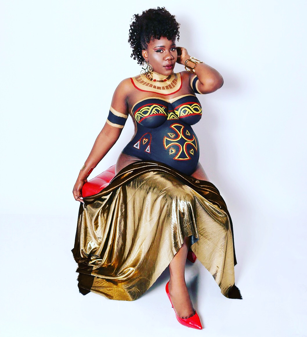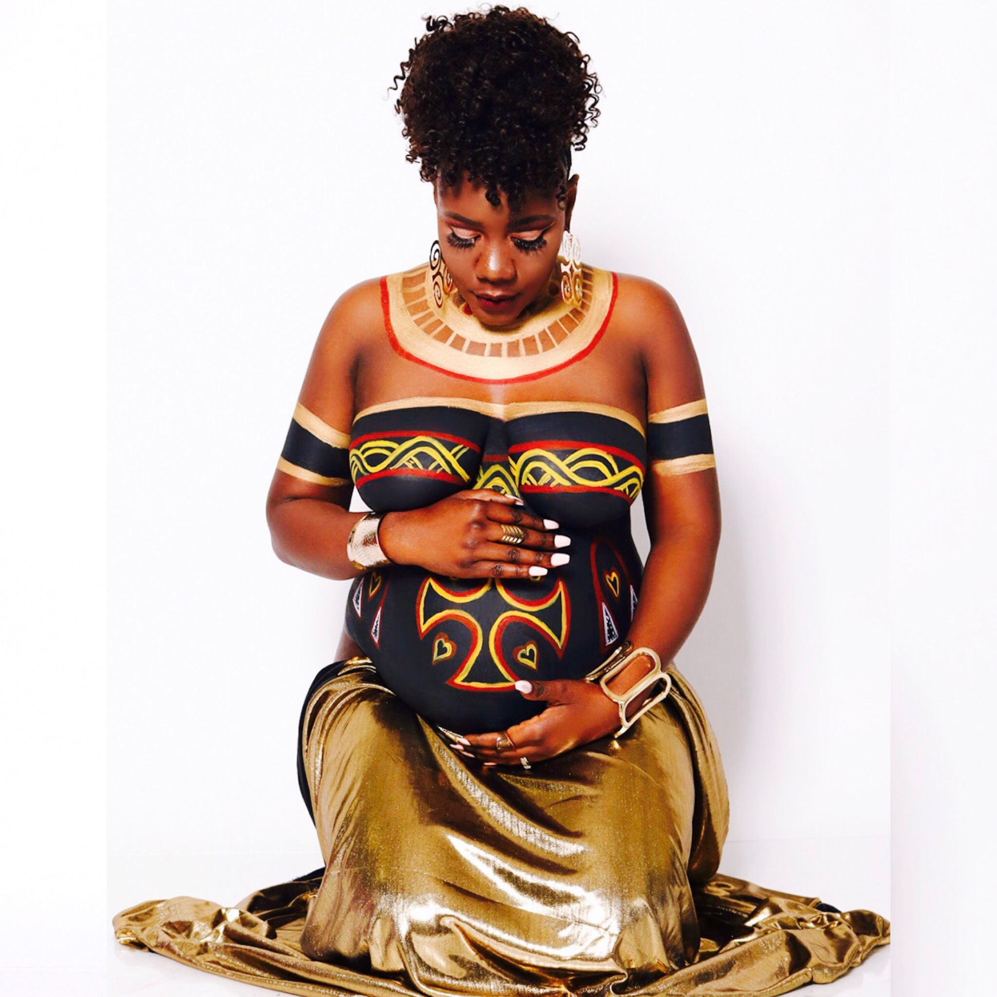 The about-to-be new mama showed off her baby bump in new glamour shots earlier this week wearing a body-hugging traditional strapless swimsuit while been accessorized with more traditional body art.