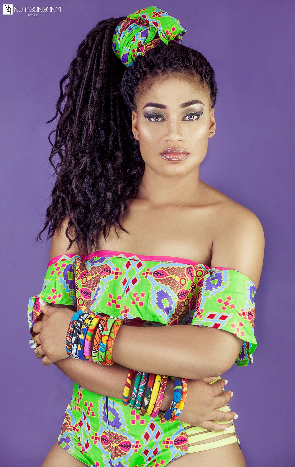 Stephanie Tum once again teams up with celebrity photographer, Njinkeng Asonganyi and makeup artist Anyi Asonganyi for a vibrant and colorful and playful photo shoot which has “I am in a happy place” written all over it.