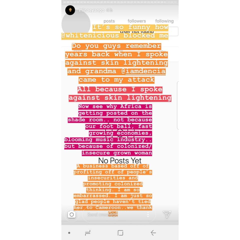 According to Miss Eyango, Dencia is doing the wrong thing by encouraging young beautiful black African women to change the color of their skin by using her famous bleaching product, Whitenicious. She went ahead to say that @whiteniciousbydencia blocked her on Instagram over her remarks.