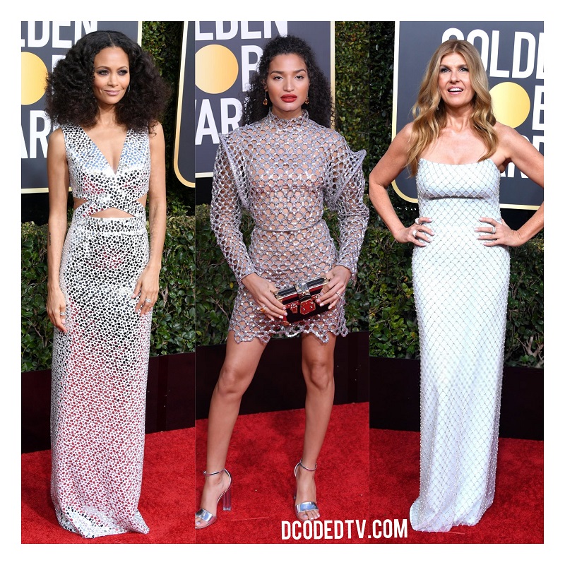 The very familiar ‘Black and White’ ensemble also took center stage at the Golden Globes. You can hardly go wrong in Black, White or both and that’s why stars like Charlize Theron showed up in a signature sleek look by Dior, ‘Aquaman’ star, Amber Heard went for an overwhelming old-fashion British look by Monique Lhuillier, Sandra O in an angelic white Atelier Versace gown and E! News host, Giuliana Rancic in Gucci, Dakota Fanning in Giorgio Armani and Sofia Carson in a complicated Giambattista Valli gown featuring her sexy hot red lips.